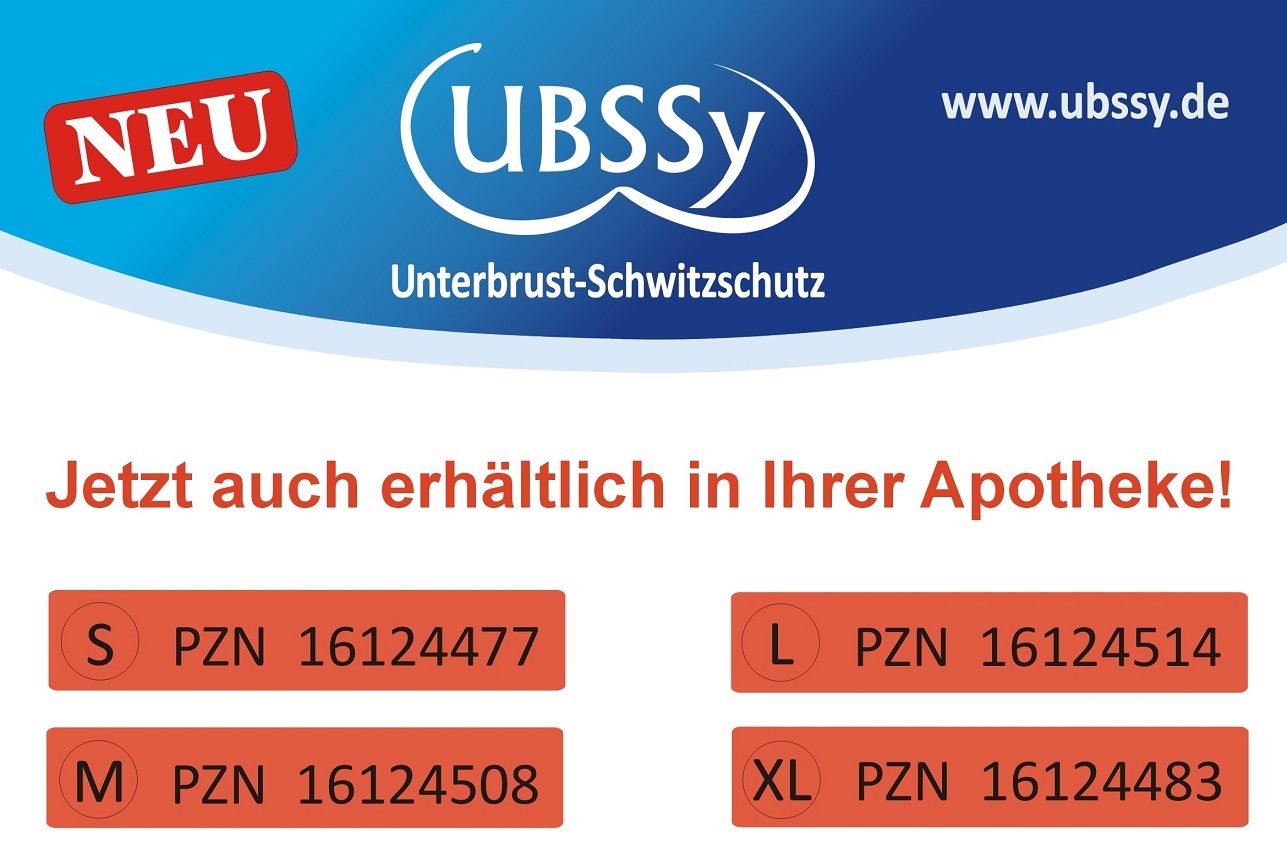 Da vor allem auch ältere Frauen - ohne Internetzugang - stark von diesem Problem betroffen sind, sind wir ständig bemüht, UBSSy auch in den stationären Handel zu bringen. Da es sich hier auch um ein Produkt mit medizinischem Nutzen handelt, favorisieren wir hierbei schwerpunktmäßig Apotheken und Sanitätsfachgeschäfte. Voraussetzung hierfür ist jedoch eine Pharmazentralnummer (PZN). Diese wurde UBSSy im August 2019 erteilt. Fragen Sie auch gerne mal bei der Apotheke Ihres Vertrauens nach UBSSy. Apotheken können Ihnen UBSSy kurzfristig über den Apotheken-Großhandel oder direkt von uns besorgen. Notieren Sie sich dazu bitte die jeweilige PZN Ihrer benötigten Größe.